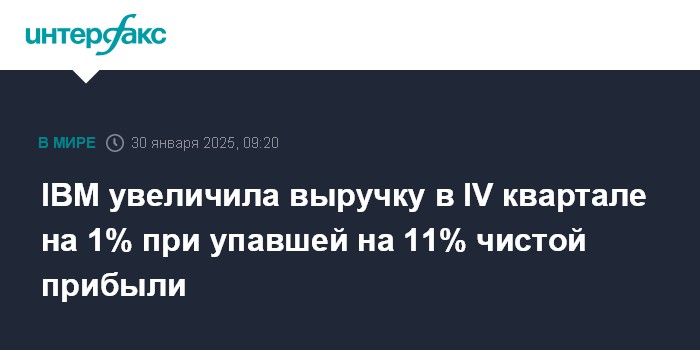 Москва. 30 января. INTERFAX.RU - Американская International Business Machines Corp. (IBM) увеличила выручку в четвертом квартале 2024 года на 1%, однако ее чистая прибыль снизилась на 11%.