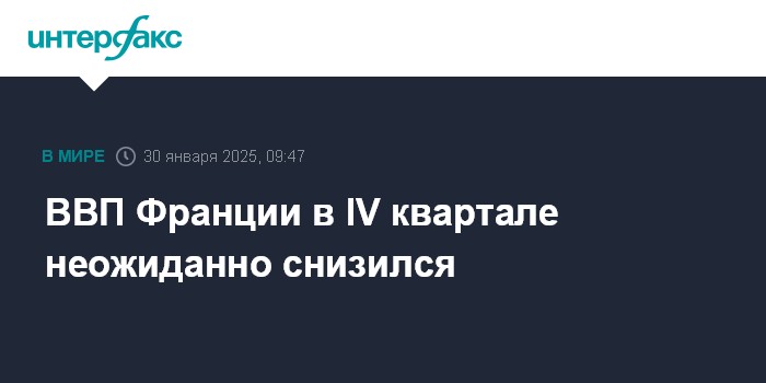 Москва. 30 января. INTERFAX.RU - Объем ВВП Франции в четвертом квартале 2024 года снизился на 0,1% по сравнению с предыдущими тремя месяцами. Об этом говорится в отчете национального статистического института Insee, представившего предварительные данные.