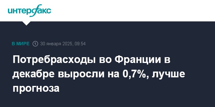 Москва. 30 января. INTERFAX.RU - Потребительские расходы во Франции в декабре увеличились на 0,7% по сравнению с предыдущим месяцем. Об этом говорится в сообщении Национального статистического управления Insee.