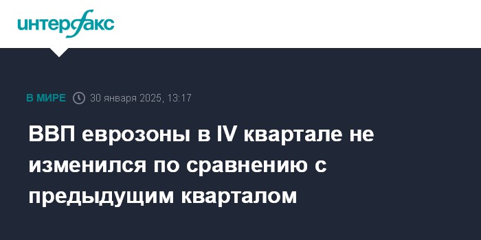 Москва. 30 января. INTERFAX.RU - ВВП еврозоны в четвертом квартале 2024 года не изменился по сравнению с предыдущими тремя месяцами. Об этом говорится в отчете статистического управления Европейского союза, представившего предварительные данные.