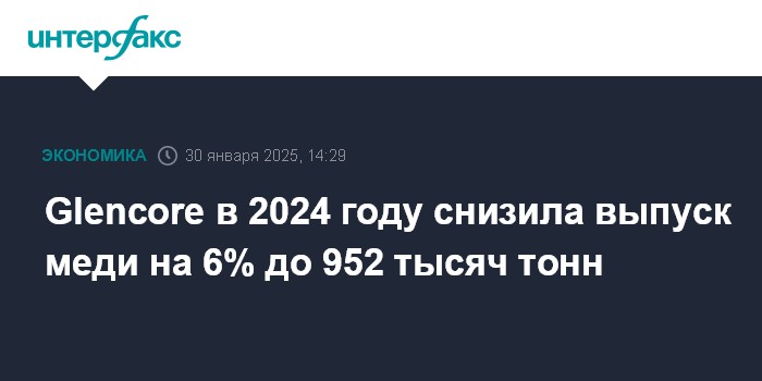 Москва. 30 января. INTERFAX.RU - Одна из крупнейших в мире диверсифицированных добывающих групп Glencore в 2024 году снизила выпуск меди на 6%, до 952 тысяч тонн, сообщила компания.