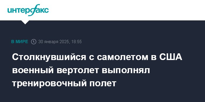 Москва. 30 января. INTERFAX.RU - Экипаж американского военного вертолета Black Hawk, столкнувшегося с пассажирским самолетом близ Вашингтона, выполнял плановый ночной тренировочный полет, сообщил в четверг глава Пентагона Пит Хегсет.
