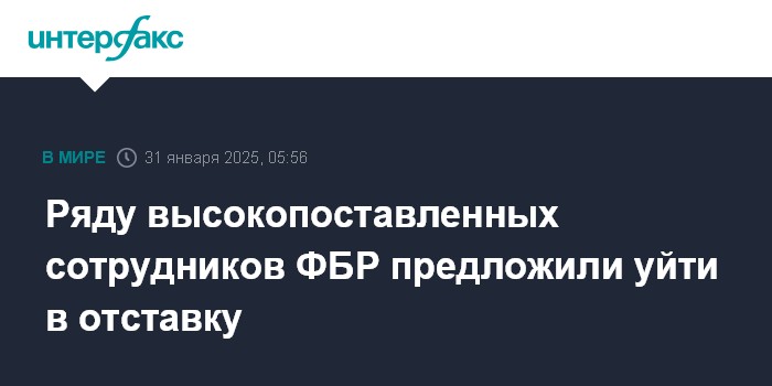 Москва. 31 января. INTERFAX.RU - Администрация президента США Дональда Трампа предложила ряду чиновников ФБР уйти в отставку с руководящих должностей или быть уволенными, сообщает телеканал CNN со ссылкой на осведомленные источники.