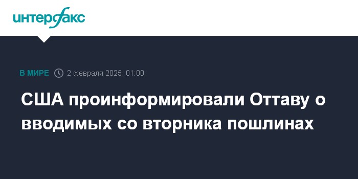 Москва. 2 февраля. INTERFAX.RU - Власти США проинформировали Оттаву о решении со вторника ввести пошлины на канадские товары, сообщает The New York Times со ссылкой на неназванных официальных лиц из Канады.