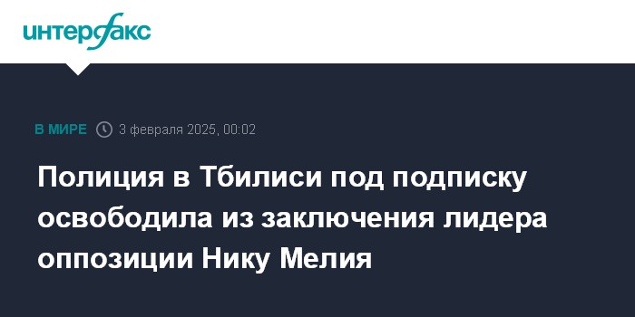 Москва. 3 февраля. INTERFAX.RU - Лидера оппозиционной партии "Коалиция за перемены" Ника Мелия был освобожден под подписку после задержания полицией в воскресенье на акции у торгового центра "Тбилиси молл". Мелия был задержан за административное правонарушение.