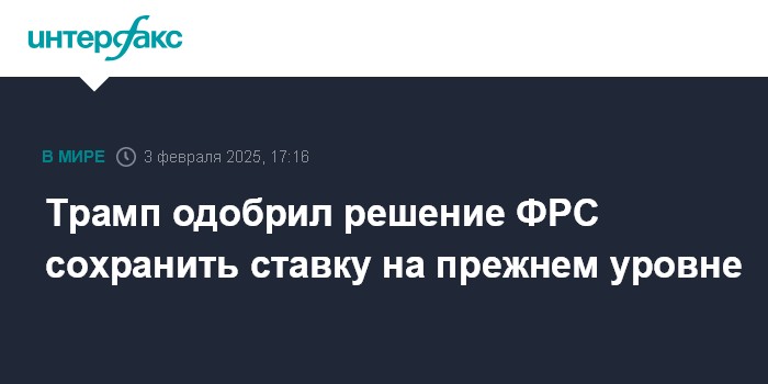 Москва. 3 февраля. INTERFAX.RU - Президент США Дональд Трамп поддержал решение Федеральной резервной системы оставить ключевую процентную ставку на прежнем уровне.