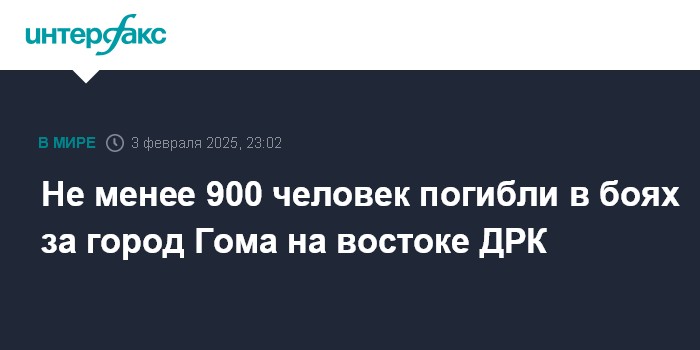 Москва. 3 февраля. INTERFAX.RU - Бои между вооруженными силами Демократической Республики Конго (ДРК) и группировкой "Движение 23 марта" (М23) за город Гома на востоке страны унесли жизни минимум 900 человек, сообщает в понедельник Associated Press со ссылкой на данные Всемирной организации здравоохранения (ВОЗ).