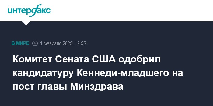Теперь для утверждения Кеннеди-младшего на посту главы Минздрава требуется голосование на пленарном заседании Сената. О вероятной дате голосования агентство не сообщает.