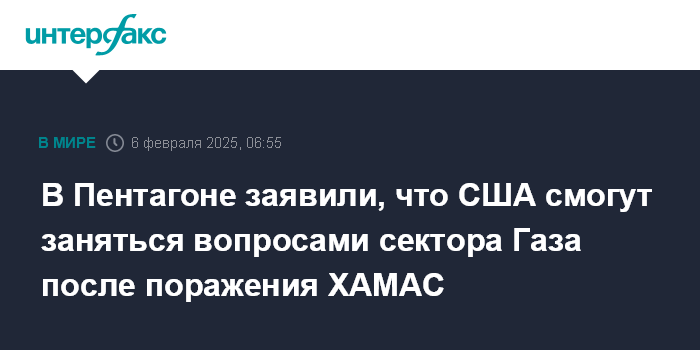 Москва. 6 февраля. INTERFAX.RU - США смогут заняться вопросами, связанными со статусом сектора Газа, только после того, как Израиль уничтожит движение ХАМАС, заявил американский министр обороны Пит Хегсет в эфире телеканала Fox News.