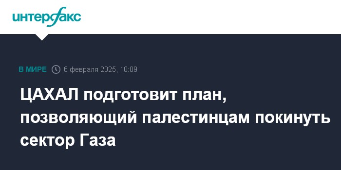 Москва. 6 февраля. INTERFAX.RU - Министр обороны Израиля Исраэль Кац поручил Армии обороны Израиля (ЦАХАЛ) разработать план, который позволит жителям сектора Газа, желающим покинуть анклав, сделать это беспрепятственно, сообщает в четверг The Jerusalem Post.