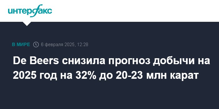 Москва. 6 февраля. INTERFAX.RU - De Beers в 2025 году планирует выпустить 20-23 млн карат алмазов, сообщила в четверг контролирующая алмазодобытчика корпорация Anglo American. Это в среднем на 32% ниже ранее опубликованного прогноза, который предполагал добычу на уровне 30-33 млн карат.