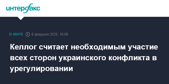 Москва. 6 февраля. INTERFAX.RU - Спецпосланник президента США по России и Украине Кит Келлог считает, что для урегулирования ситуации на Украине необходимо непосредственное участие всех имеющих к ней отношение сторон.