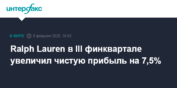 Москва. 6 февраля. INTERFAX.RU - Американский дом моды Ralph Lauren Corp. в третьем квартале 2025 финансового года увеличил чистую прибыль на 7,5%, при этом скорректированный показатель и выручка превзошли ожидания рынка.