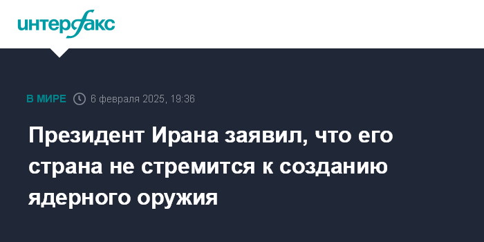 Москва. 6 февраля. INTERFAX.RU - Иран не стремится к созданию ядерного оружия, поскольку доктрина Исламской республики отвергает применение такого оружия, заявил на встрече с иностранными дипломатами президент Ирана Масуд Пезешкиан.