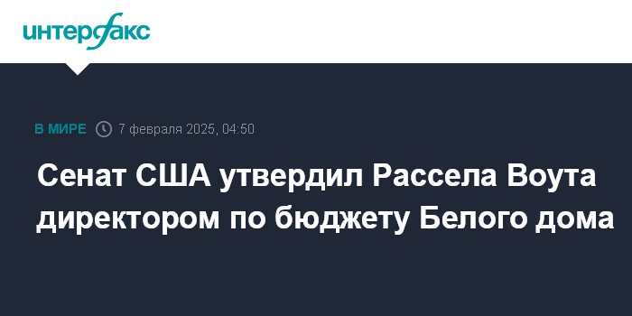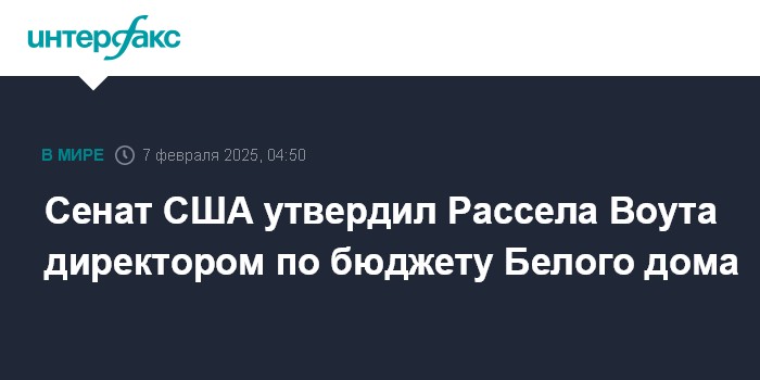Москва. 7 февраля. INTERFAX.RU - Сенат США 53 голосами против 47 утвердил на должность главы Административно-бюджетного управления Белого дома Рассела Воута, сообщили американские СМИ.