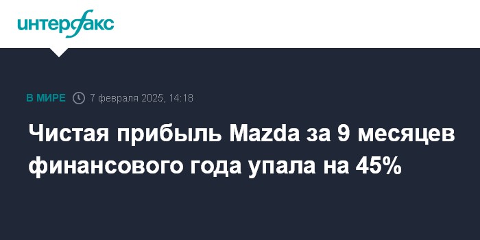 Москва. 7 февраля. INTERFAX.RU - Японский автопроизводитель Mazda Motor Corp. за девять месяцев 2025 финансового года (апрель-декабрь) сократил чистую прибыль на 45,3% относительно того же периода годом ранее – до 90,6 млрд иен ($595 млн), сообщается в отчетности.