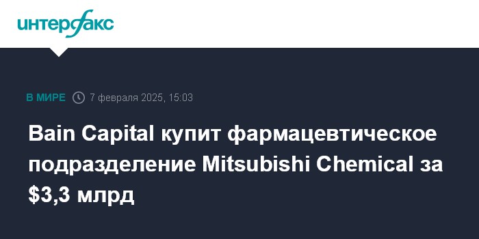 Москва. 7 февраля. INTERFAX.RU - Американская инвесткомпания Bain Capital покупает Mitsubishi Tanabe Pharma – фармацевтическое подразделение японской Mitsubishi Chemical Group, за 510 млрд иен ($3,3 млрд).