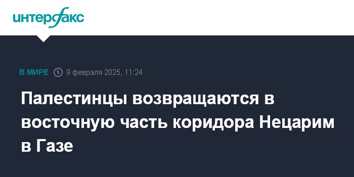 Москва. 9 февраля. INTERFAX.RU - Палестинцы начали прибывать в восточную часть коридора Нецарим, разделяющего центр сектора Газа, после того как израильские военные ночью ушли из этой зоны в рамках соглашения о прекращении огня между Израилем и группировкой ХАМАС, сообщает The Times of Israel.