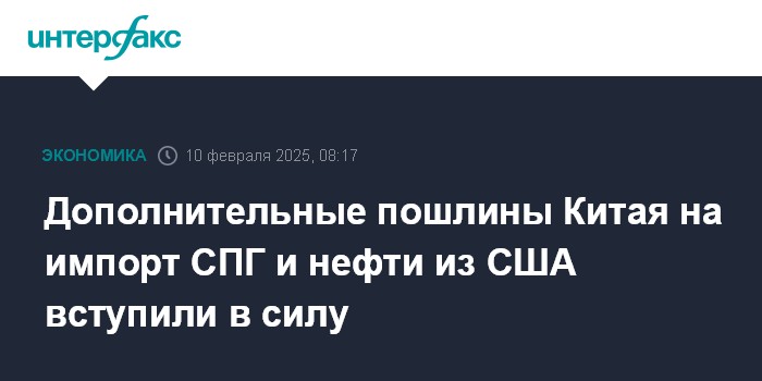 Москва. 10 февраля. INTERFAX.RU - Китай с 10 февраля вводит дополнительную пошлину в размере 15% на импорт сжиженного природного газа и угля из США, а также 10%-ную пошлину на импорт нефти.