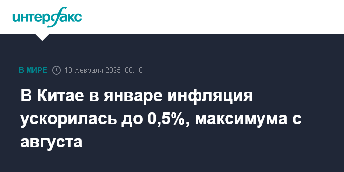 Москва. 10 февраля. INTERFAX.RU - В Китае в январе потребительские цены (индекс CPI) выросли на максимальные с августа 2024 года 0,5% в годовом выражении, говорится в отчете Государственного статистического управления (ГСУ).