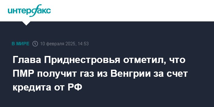 Москва. 10 февраля. INTERFAX.RU - Приднестровье после 10 февраля будет получать газ из Венгрии при технической и кредитной поддержке России, сообщил лидер непризнанной Приднестровской Молдавской республики (ПМР) Вадим Красносельский.