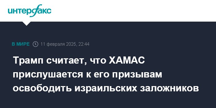 Москва. 11 февраля. INTERFAX.RU - Президент США Дональд Трамп выразил уверенность, что в ХАМАС прислушаются к его словам и отпустят всех оставшихся израильских заложников в субботу, сообщает во вторник The Times of Israel.