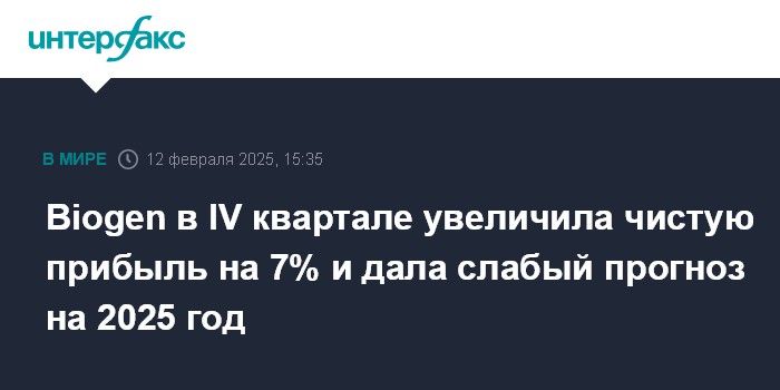 Москва. 12 февраля. INTERFAX.RU - Американская биотехнологическая компания Biogen Inc. в четвертом квартале 2024 года увеличила чистую прибыль почти на 7% и выручку на 3%, но дала слабый прогноз на текущий год.