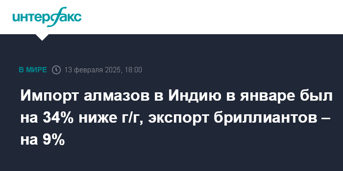 Москва. 13 февраля. INTERFAX.RU - Индия в январе 2025 года импортировала 6,34 млн карат алмазов, что на 34% ниже данных годичной давности и на 11% ниже данных декабря. Это следует из предварительных данных Совета по содействию экспорту драгоценных камней и ювелирных изделий Индии (Gem & Jewellery Export Promotion Council, GJEPC).