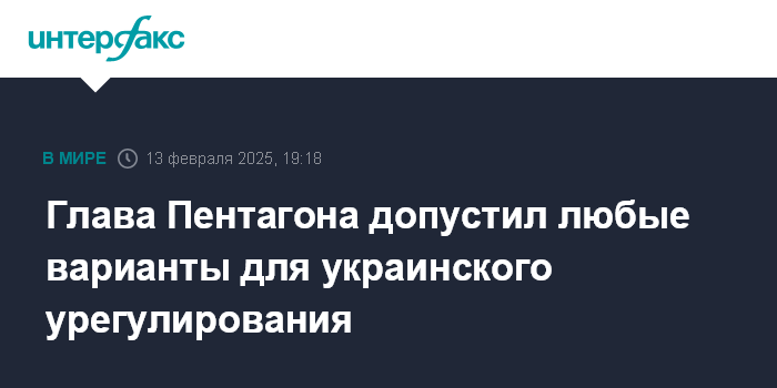 Москва. 13 февраля. INTERFAX.RU - Любые варианты могут обсуждаться при работе над украинским урегулированием, заявил в четверг глава Пентагона Пит Хегсет.
