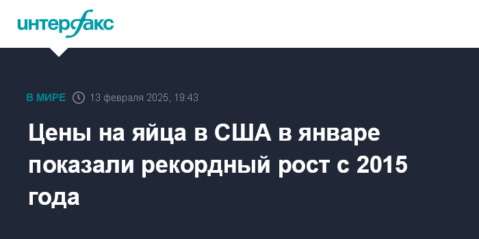 Средняя розничная цена дюжины крупных яиц категории А в прошлом месяце составляла $4,95, что вдвое превышает показатель год назад и является рекордом, по данным Минтруда. Предыдущий максимум в $4,82 был установлен в январе 2023 года.