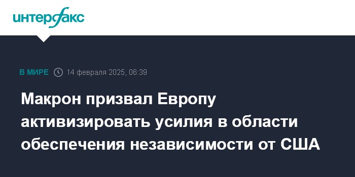 Москва. 14 февраля. INTERFAX.RU - Президент Франции Эммануэль Макрон требует от Европы наращивать усилия, чтобы с приходом к власти Дональда Трампа обеспечить независимость континента от Соединенных Штатов в экономическом, технологическом в военном отношениях.