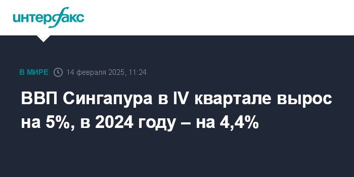 Москва. 14 февраля. INTERFAX.RU - Экономика Сингапура в четвертом квартале 2024 года увеличилась на 5% относительно того же периода прошлого года, по окончательным данным министерства торговли и промышленности страны.