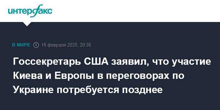 Москва. 16 февраля. INTERFAX.RU - США будут готовы подключить Киев и европейских партнеров к процессу украинского урегулирования на более поздних этапах, заявил в воскресенье госсекретарь США Марко Рубио.