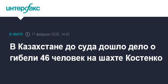 Москва. 17 февраля. INTERFAX.RU - Межведомственная следственно-оперативная группа завершила расследование взрывов в шахте имени Костенко АО "АрселорМиттал Темиртау" (ныне Qarmet), произошедших в октябре 2023 года, в результате которых погибли 46 человек, сообщил в соцсети генпрокурор Казахстана Берик Асылов.