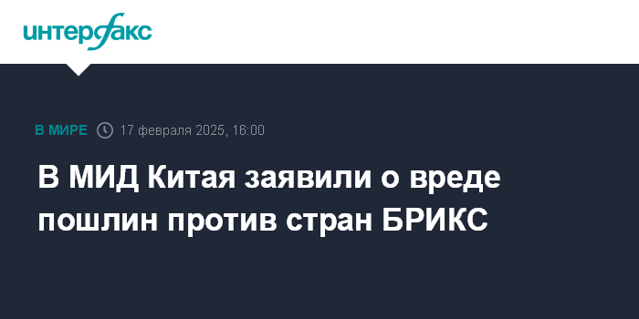 Москва. 17 февраля. INTERFAX.RU - Страны БРИКС не вступают в конфронтацию с третьими сторонами, и пошлины на их товары, которые могут ввести США, не принесут пользы и навредят общим интересам, заявил представитель МИД КНР Го Цзякунь.