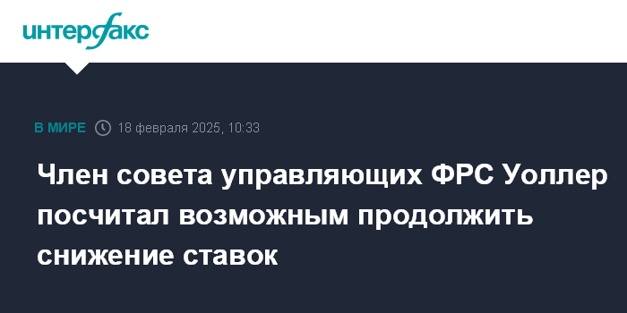 Москва. 18 февраля. INTERFAX.RU - Федеральной резервной системе (ФРС) необходимо будет продолжить снижение процентных ставок, если инфляция продолжит показывать движение в сторону целевого уровня, полагает член совета управляющих ФРС Кристофер Уоллер.