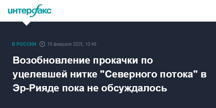 Москва. 18 февраля. INTERFAX.RU - Возобновление прокачки газа по уцелевшей нитке "Северного потока" пока на обсуждалось в ходе контактов в Эр-Рияде, заявил во вторник глава РФПИ Кирилл Дмитриев.