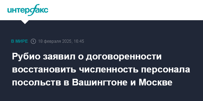 "Рубио заявил, что официальные лица из США и РФ договорились восстановить штаты своих посольств", - отмечает агентство.