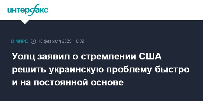 Москва. 18 февраля. INTERFAX.RU - Вашингтон нацелен на окончательное, а не временное урегулирование украинской проблемы, стремится к быстрой работе в этом направлении, заявил помощник президента США по нацбезопасности Майк Уолц после переговоров с российской делегацией в Эр-Рияде. Об этом сообщает Bloomberg.