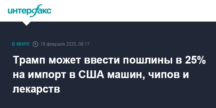 Москва. 19 февраля. INTERFAX.RU - Президент США Дональд Трамп может ввести в начале апреля пошлины в 25% на импорт в Соединенные Штаты автомобилей, полупроводниковых компонентов и фармацевтической продукции.