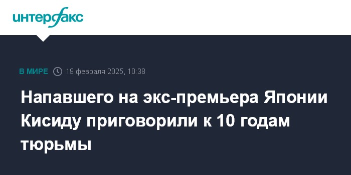 Москва. 19 февраля. INTERFAX.RU - Мужчина, бросивший в 2023 году самодельное взрывное устройство в занимавшего на тот момент пост премьер-министра Японии Фумио Кисиду, приговорен к 10 годам тюремного заключения, сообщает в среду агентство Kyodo.