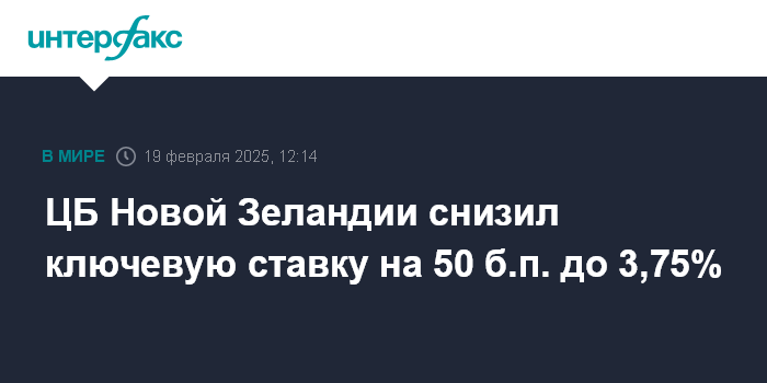 Москва. 19 февраля. INTERFAX.RU - Резервный банк Новой Зеландии (ЦБ страны) в среду снизил ключевую ставку на 50 базисных пунктов до 3,75% годовых.