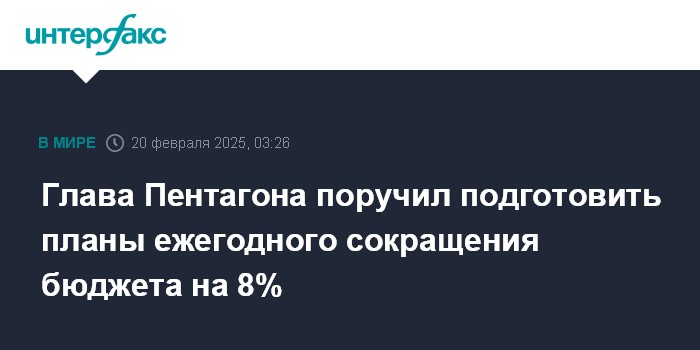 Москва. 20 февраля. INTERFAX.RU - Министр обороны США Пит Хегсет приказал высшему руководству Пентагона и всей армии США разработать планы сокращения оборонного бюджета на 8% в течение каждого из следующих пяти лет, сообщает Washington Post.