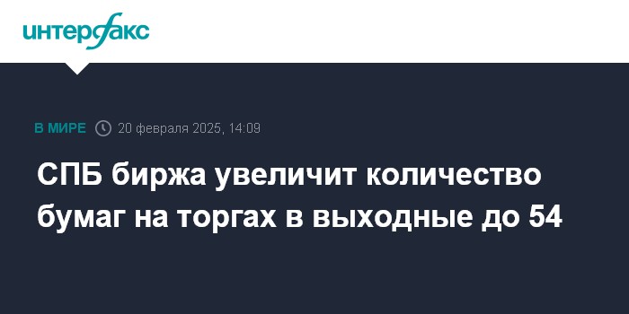 Москва. 20 февраля. INTERFAX.RU - СПБ биржа добавит 16 ценных бумаг российских компаний в перечень доступных для сделок по будням, в субботу и воскресенье.