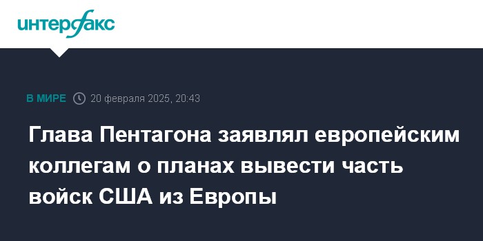 Москва. 20 февраля. INTERFAX.RU - Шеф Пентагона Пит Хегсет в ходе поездки в Европу на прошлой неделе говорил о намерениях США вывести из региона часть американских военнослужащих. Об этом сообщает в четверг The Wall Street Journal (WSJ) со ссылкой на источник.