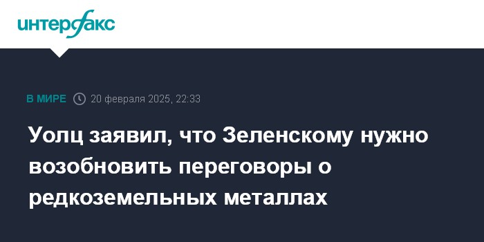 Москва. 20 февраля. INTERFAX.RU - Советник президента США по национальной безопасности Майк Уолц заявил в четверг, что президенту Украины Владимиру Зеленскому следует вернуться к обсуждению соглашения с Вашингтоном по редкоземельным металлам.