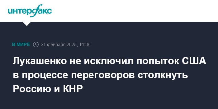 Москва. 21 февраля. INTERFAX.RU - Президент Белоруссии Александр Лукашенко заявил, что абсолютно погружен в переговоры России и США по ситуации на Украине, и предполагает, что американцы попробуют политически столкнуть россиян и китайцев. Его слова приводит его пресс-служба.