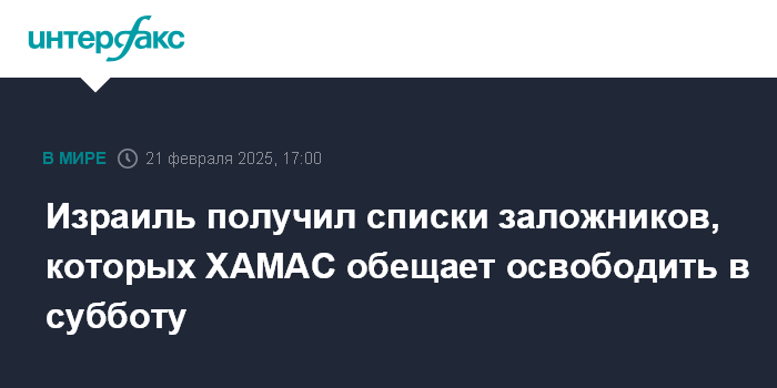 Москва. 21 февраля. INTERFAX.RU - Власти Израиля получили списки заложников, которых палестинское движение ХАМАС намерено освободить в субботу, сообщает в пятницу The Jerusalem Post.