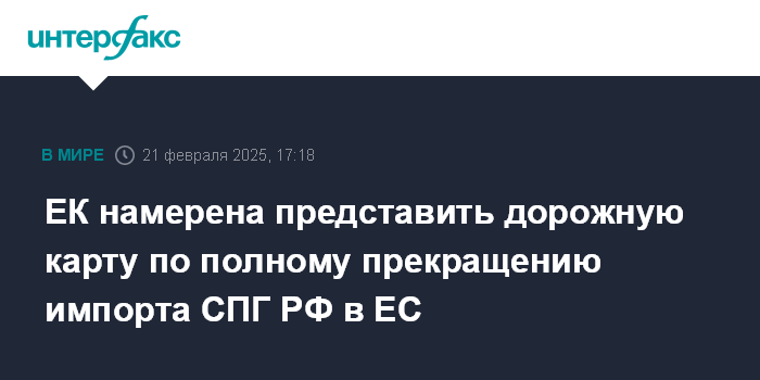 Москва. 21 февраля. INTERFAX.RU - Еврокомиссия (ЕК) намерена в ближайшие недели представить предложения по полному прекращению импорта российского СПГ в страны Евросоюза, заявила официальный представитель ЕК Анна-Кайса Итконен.