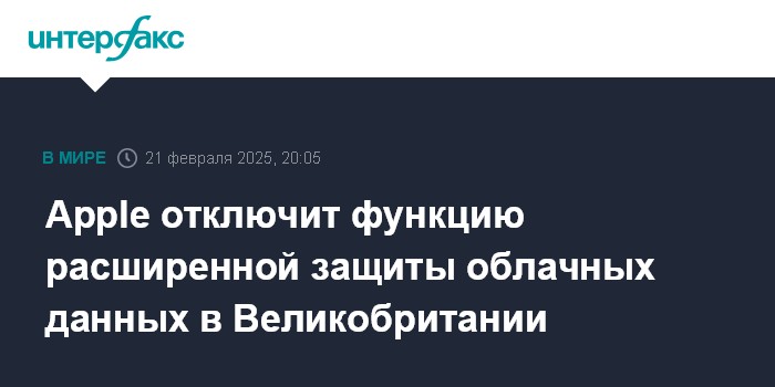 Москва. 21 февраля. INTERFAX.RU - Apple Inc. отключит функцию расширенной защиты облачных данных (Advanced Data Protection, ADP) в Великобритании.
